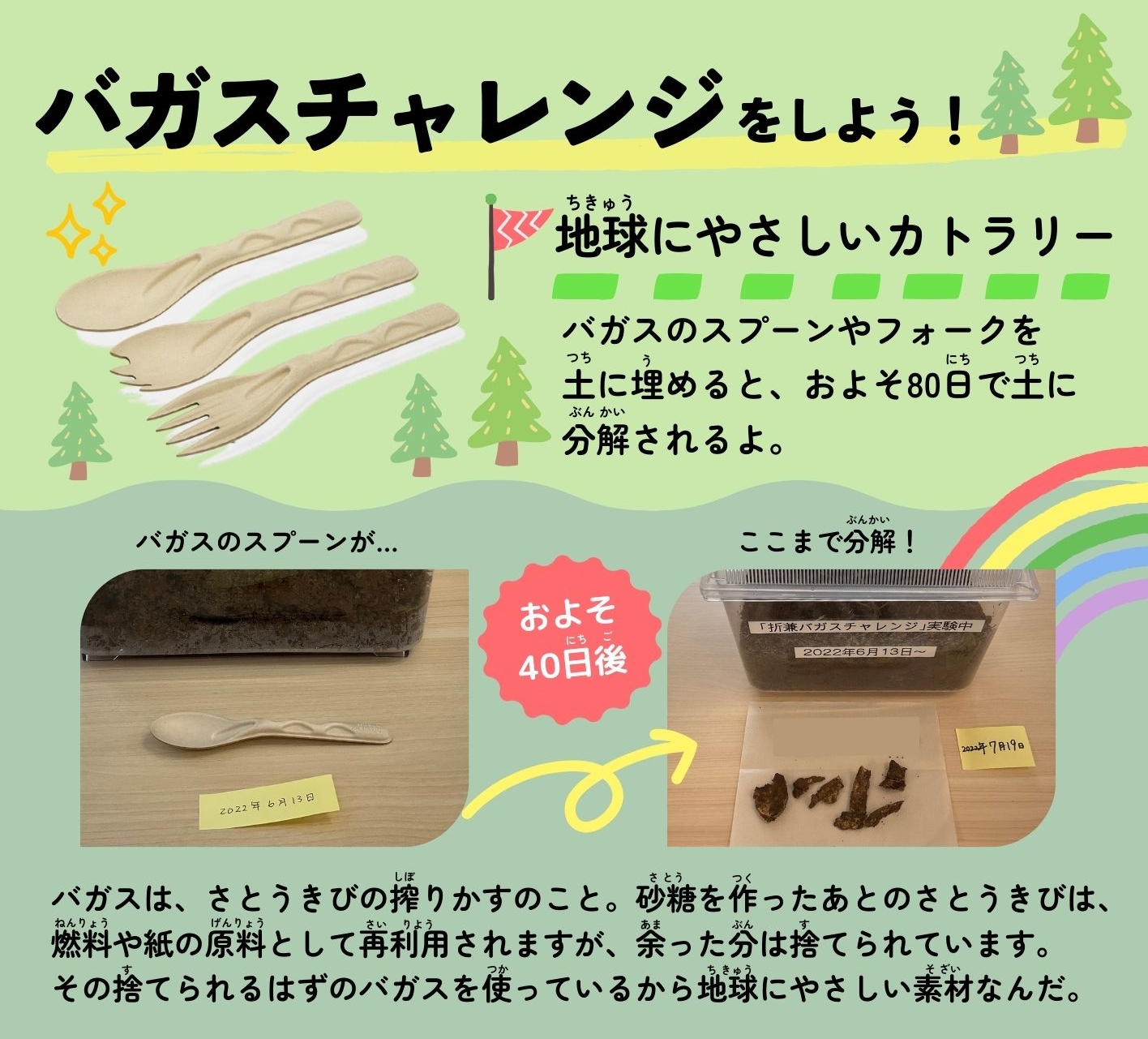 バガスのすごいところは、プラスチックに比べて、燃やしたときに排出される二酸化炭素量を81%削減できること。そしてなにより、土に埋めるとおよそ80日で分解されちゃうんだ! 海の場合は、156日で分解されるというからビックリだね! まさに、SDGsな素材なんだよ。