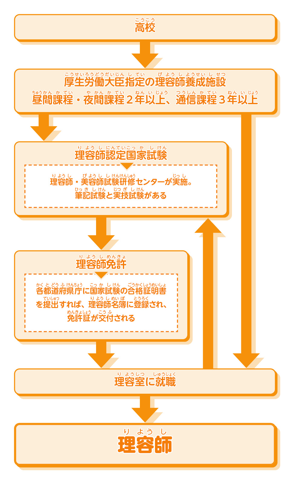 理容師の仕事につくための主なルートが一目で分かるチャートだよ!