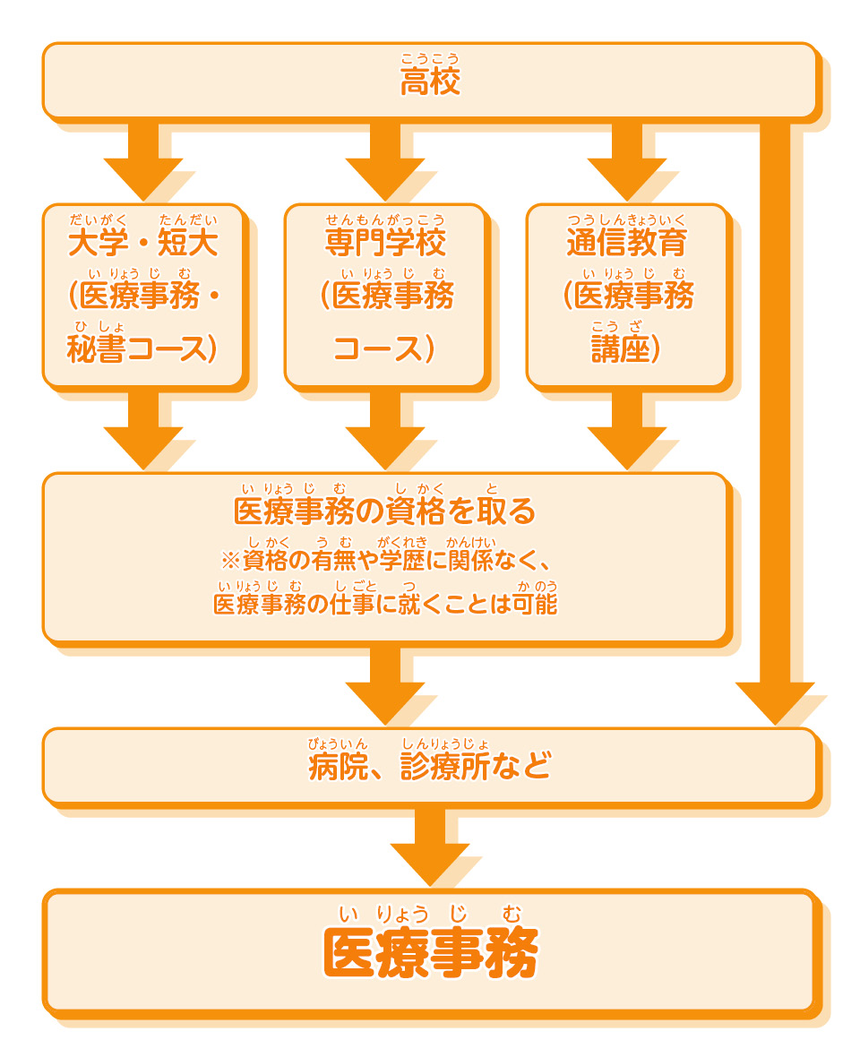 医療事務の仕事につくための主なルートが一目で分かるチャートだよ!
