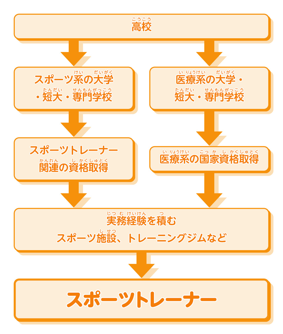 スポーツをするのに必要な体力をつけるための食事やトレーニングを、選手一人一人の力や体質に合わせてアドバイスする。またケガを防ぐために、練習や試合の前に体の弱い部分をテーピングしたり、ケガをしたときに手当したりするはもちろん、選手の動きや表情から、いち早くケガを見つけだすことも大切な仕事だ。筋肉疲労を改善するためにマッサージもする。いろいろなスポーツを担当するため、各種スポーツの知識とトレーナーとしての専門知識や技術が必要だ。選手と、スポーツの苦しみと喜びを分かち合える瞬間が、やりがいになる。