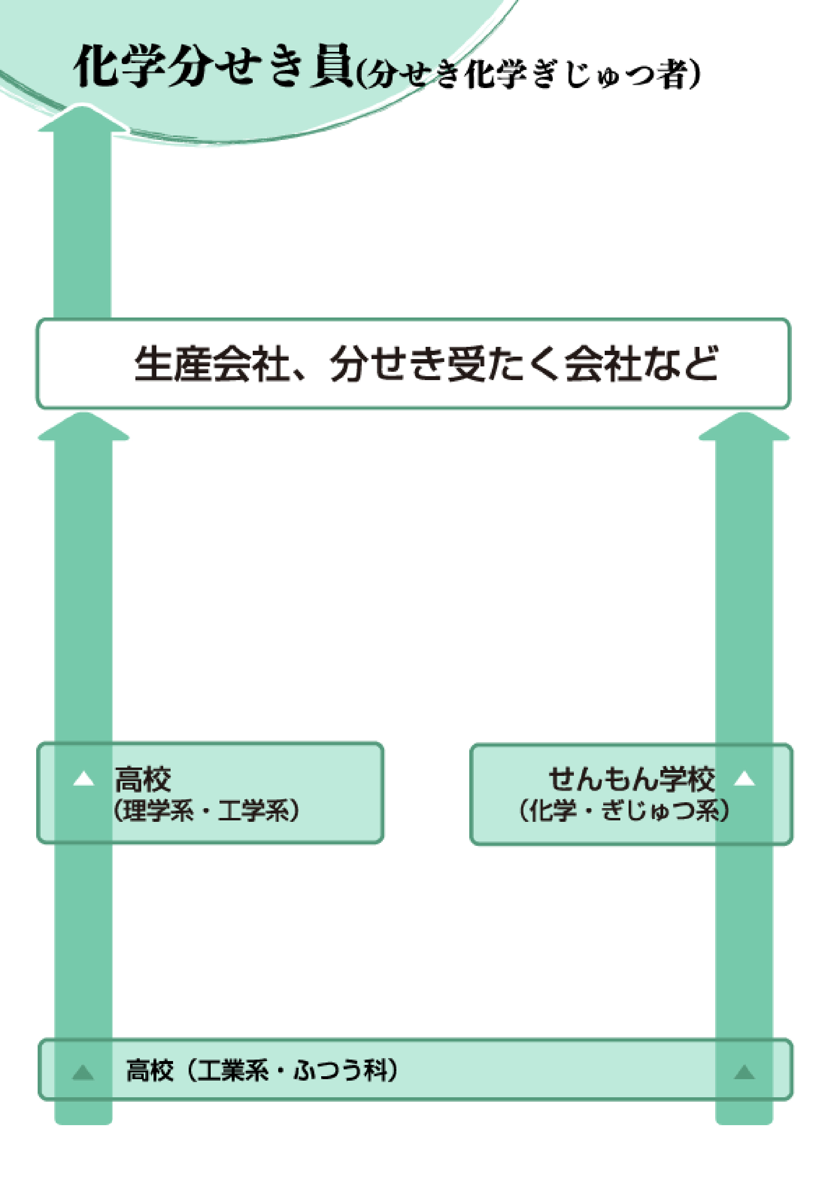 化学分析員になるには、工業高校の工業化学科、分析化学専門学校、大学の理学部化学科、工学部化学学科などで、化学などの基礎知識を学ぶことが必要だ。分析には正確さと速さが求められるため、判断力も問われる。研究所に入ってからは、先輩の分析員から分析技術を学び、実践の中でも日々技術を覚えていく。分析をいらいした人の希望にこたえるために、どんな物質でも一番よい方法で分析できるようになるまでには、10年以上はかかると言われている。