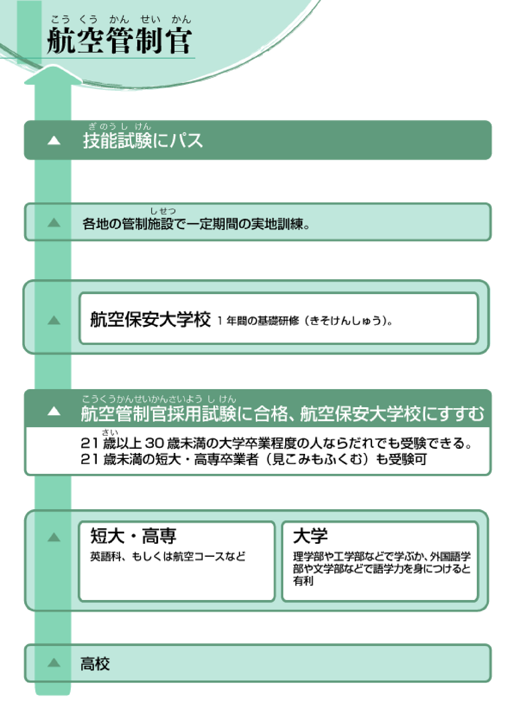 航空管制官になるには、航空管制官採用試験に合格するか、航空保安大学校航空管制科に本科生として進学する方法の2通りある。航空管制官採用試験は、21歳以上30歳未満が受験できるが(視力、聴覚等に条件あり)、合格率は平成25年度で約6%の狭き門。航空保安大学校の試験は、高卒以上21歳未満が受験でき、航空管制科は10~20倍の競争率となっている。どちらも筆記試験や身体検査のほか、英語のリーディング、ライティングが必要となるので、英語の勉強は不可欠だ。