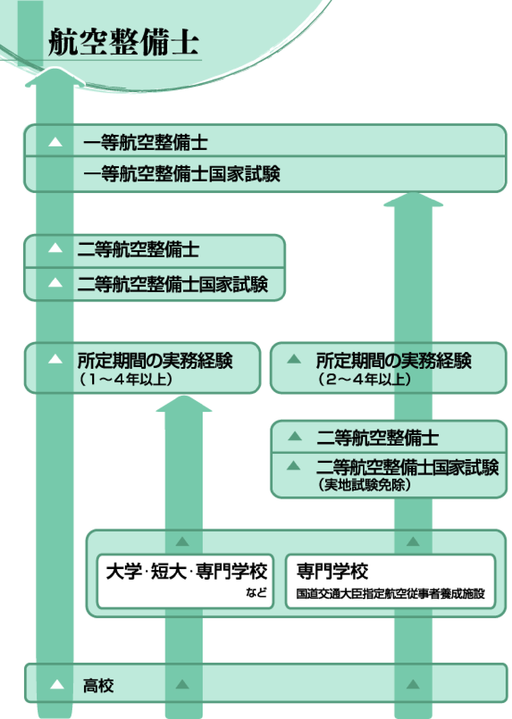 航空整備士の国家試験を受験するには、一等の場合は20歳以上、二等の場合は19歳以上であり、所定の整備実務経験を積むか、航空専門学校を卒業する2つの方法がある。航空工場整備士は18歳以上で所定の整備実務経験が必要。試験は年2回程度、学科と実地試験が行われる。