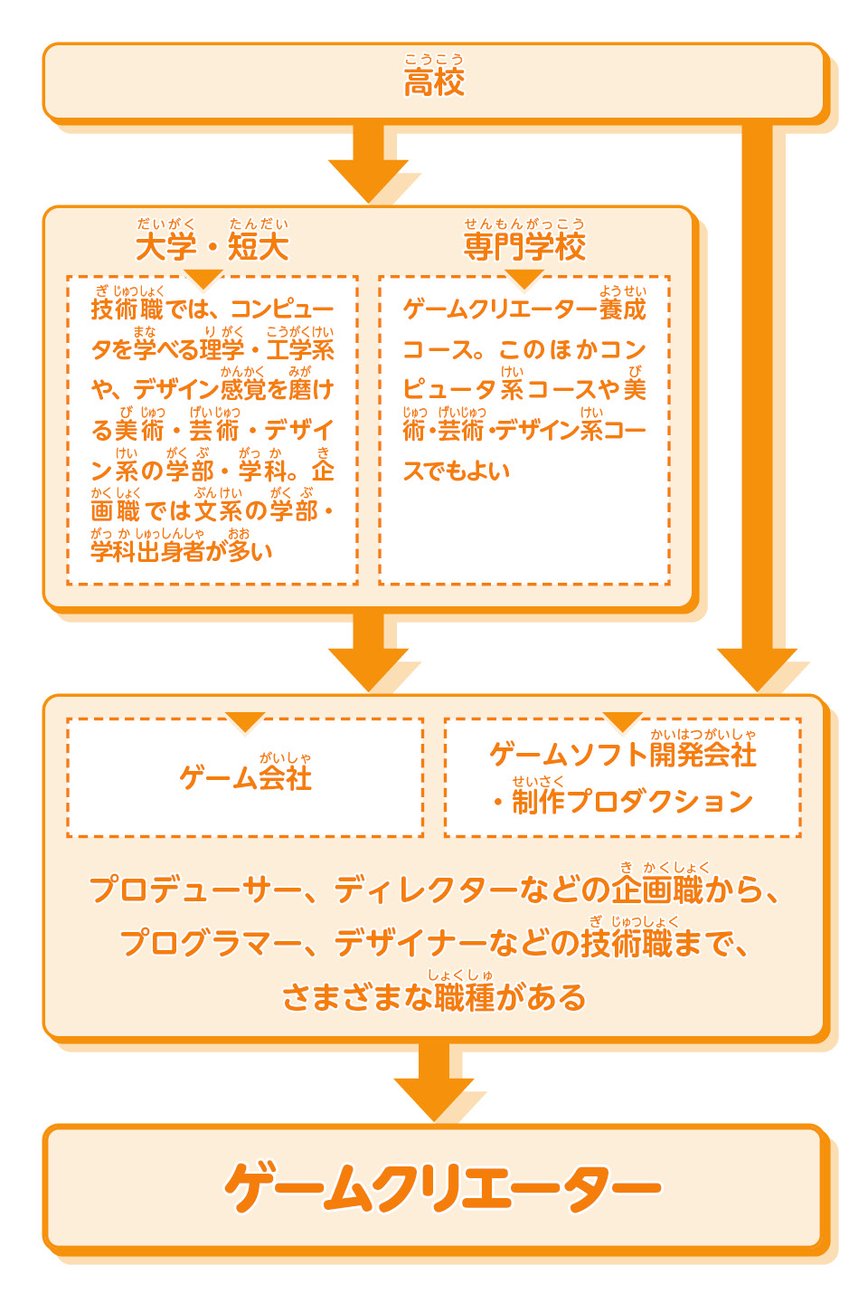 ゲームクリエーターの仕事につくための主なルートが一目で分かるチャートだよ!