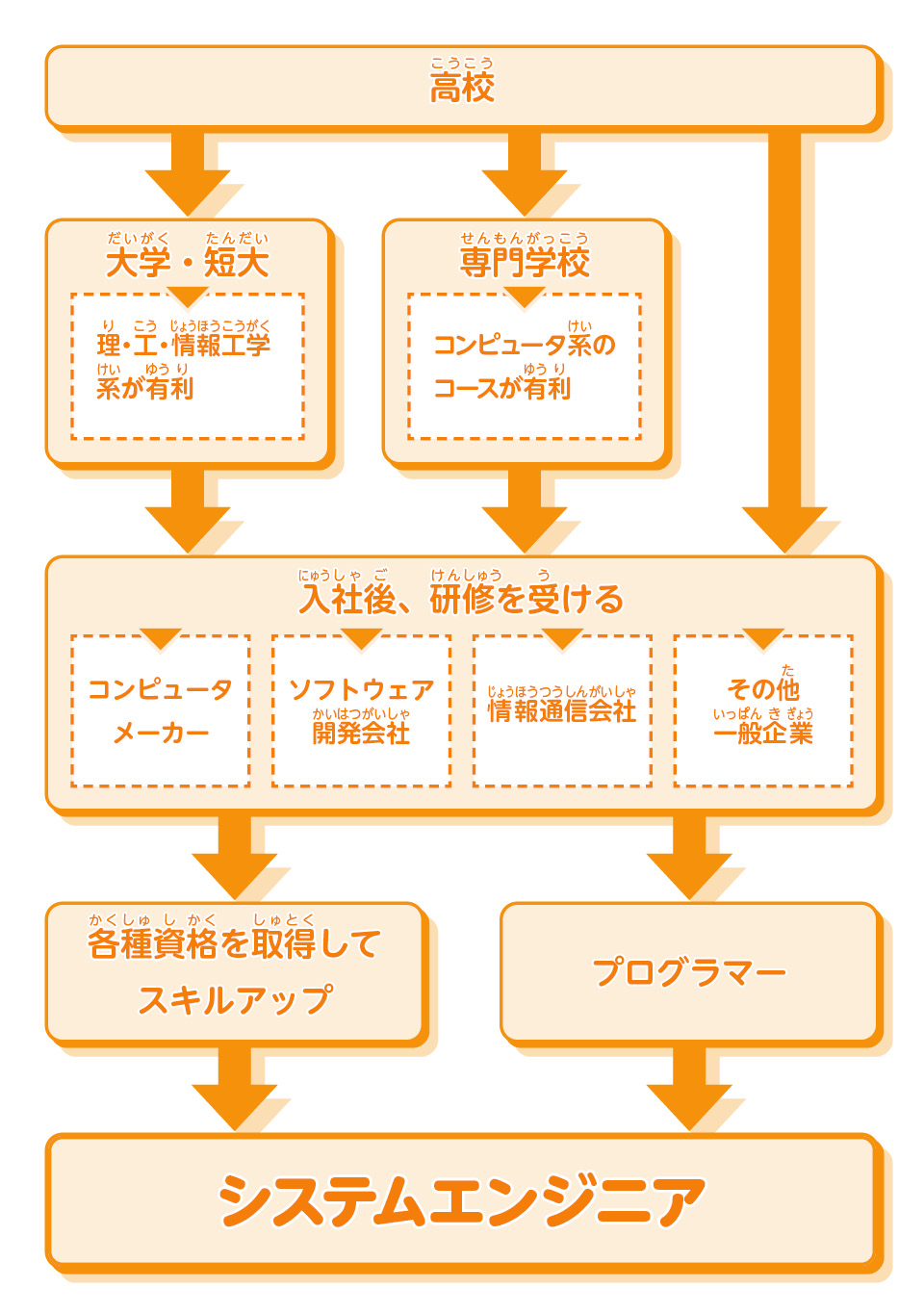 システムエンジニアの仕事につくための主なルートが一目で分かるチャートだよ!