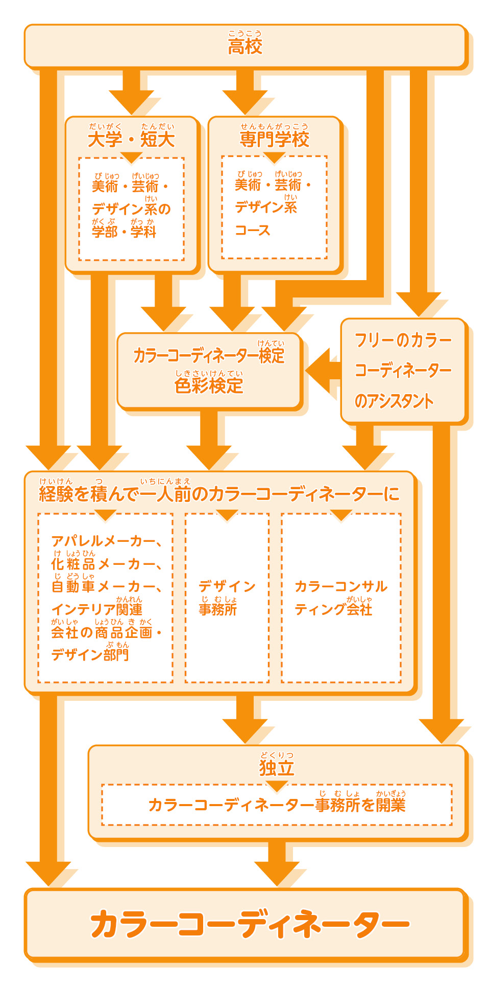 カラーコーディネーターの仕事につくための主なルートが一目で分かるチャートだよ!