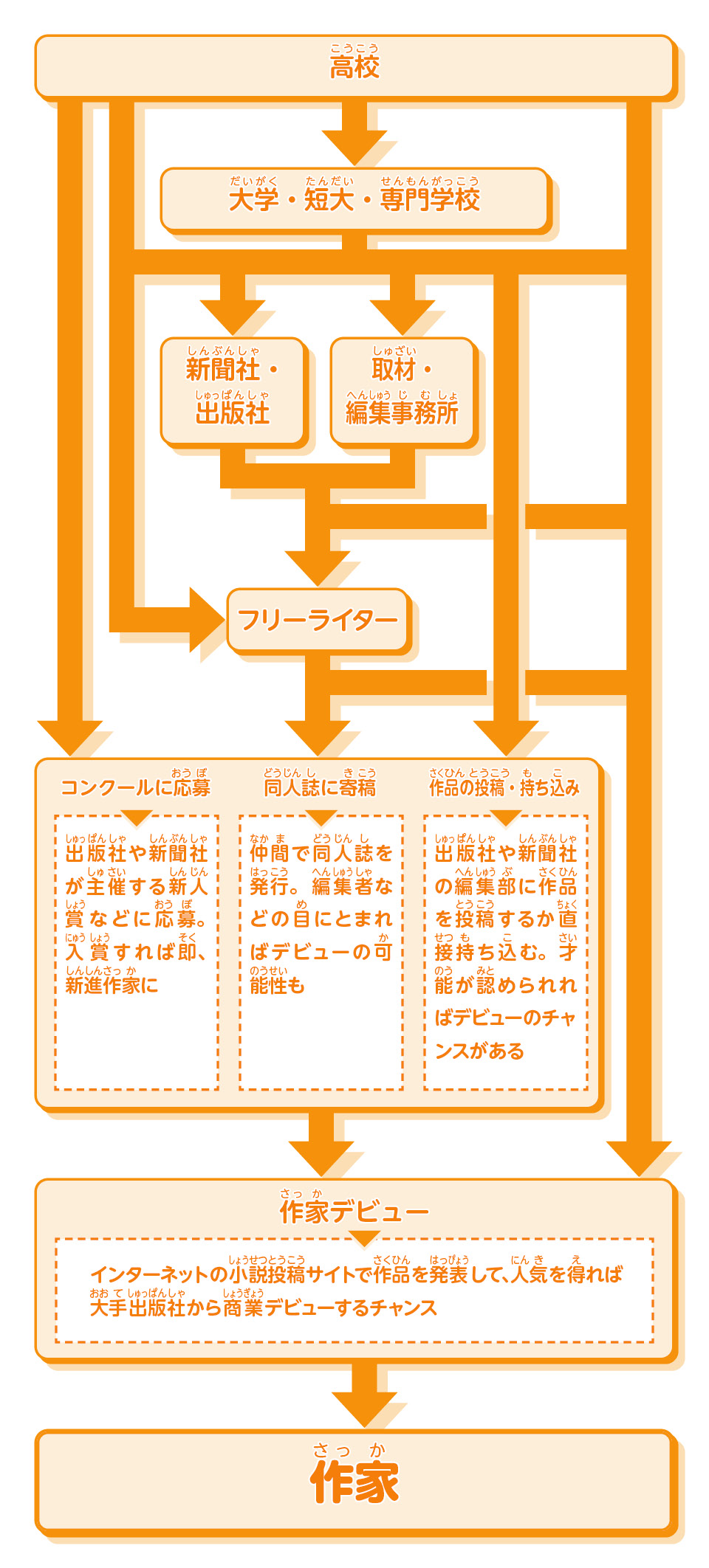 作家の仕事につくための主なルートが一目で分かるチャートだよ!