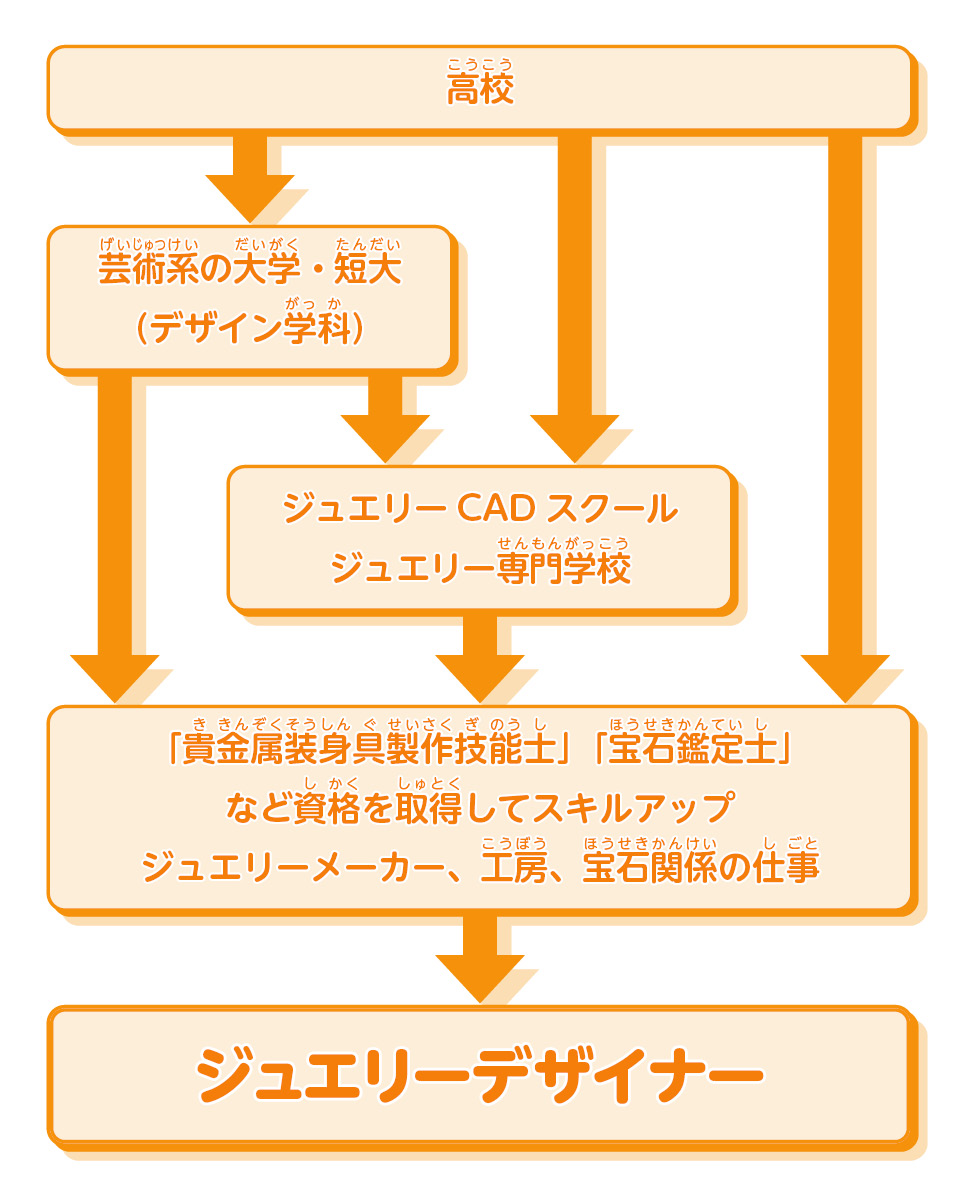 ジュエリーデザイナーの仕事につくための主なルートが一目で分かるチャートだよ!