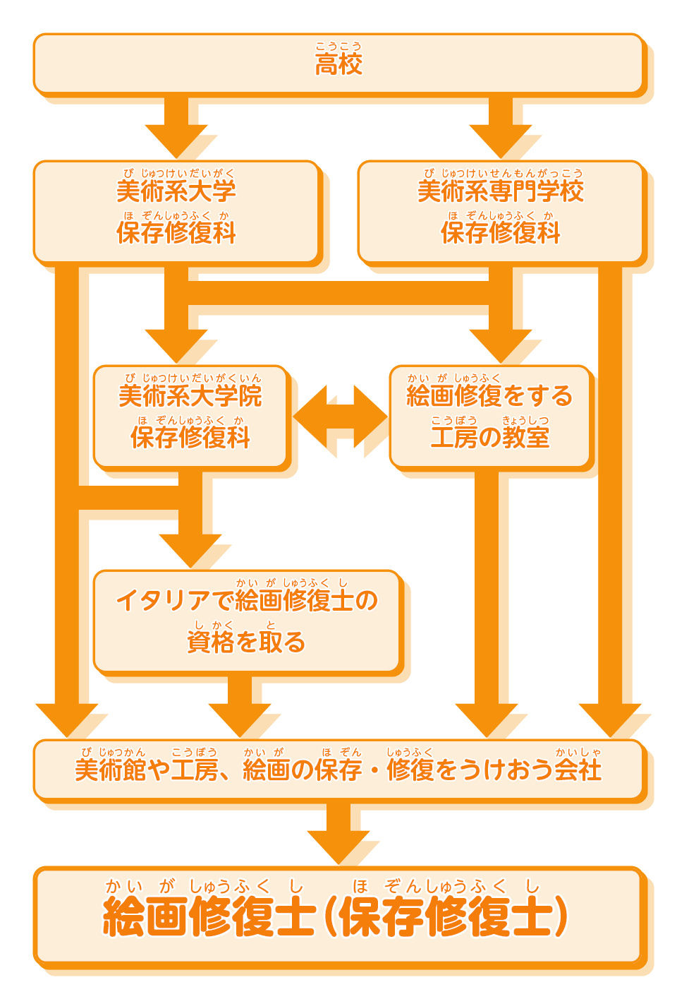 絵画修復士(保存修復士)の仕事につくための主なルートが一目で分かるチャートだよ!