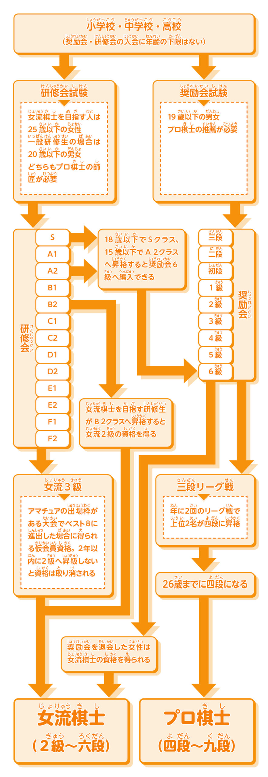 日本将棋連盟の「奨励会」は、男女の区別なく入会できる。だが、2021年現在、奨励会の四段になった女性はおらず、プロの「女性棋士」はいない。しかし、それとは別に女性だけのプロ制度がある。それが「女流棋士」だ。女流棋士になるには、日本将棋連盟が開催する「研修会」に参加する。対象となるのは、女流棋士を目指す25歳以下のアマチュアの女性。そこで規程の成績をあげれば女流2級に昇格する。女流2級からが正式なプロの女流棋士だ。また、奨励会に入会していた女性も奨励会を退会することで女流棋士になれる。奨励会6級以上2級以下で退会すると女流2級の資格を、奨励会1級以上で退会すると退会時の級位、段位のまま女流棋士の資格を得る。女流棋士同士が対局する公式戦には、7つのタイトル戦と1つの一般女流棋戦がある。対局がないときは、研究会に参加して将棋のうでをみがいたり、将棋教室でアマチュアを指導する。将棋のイベントで「将棋のおねえさん」として活動することもある。