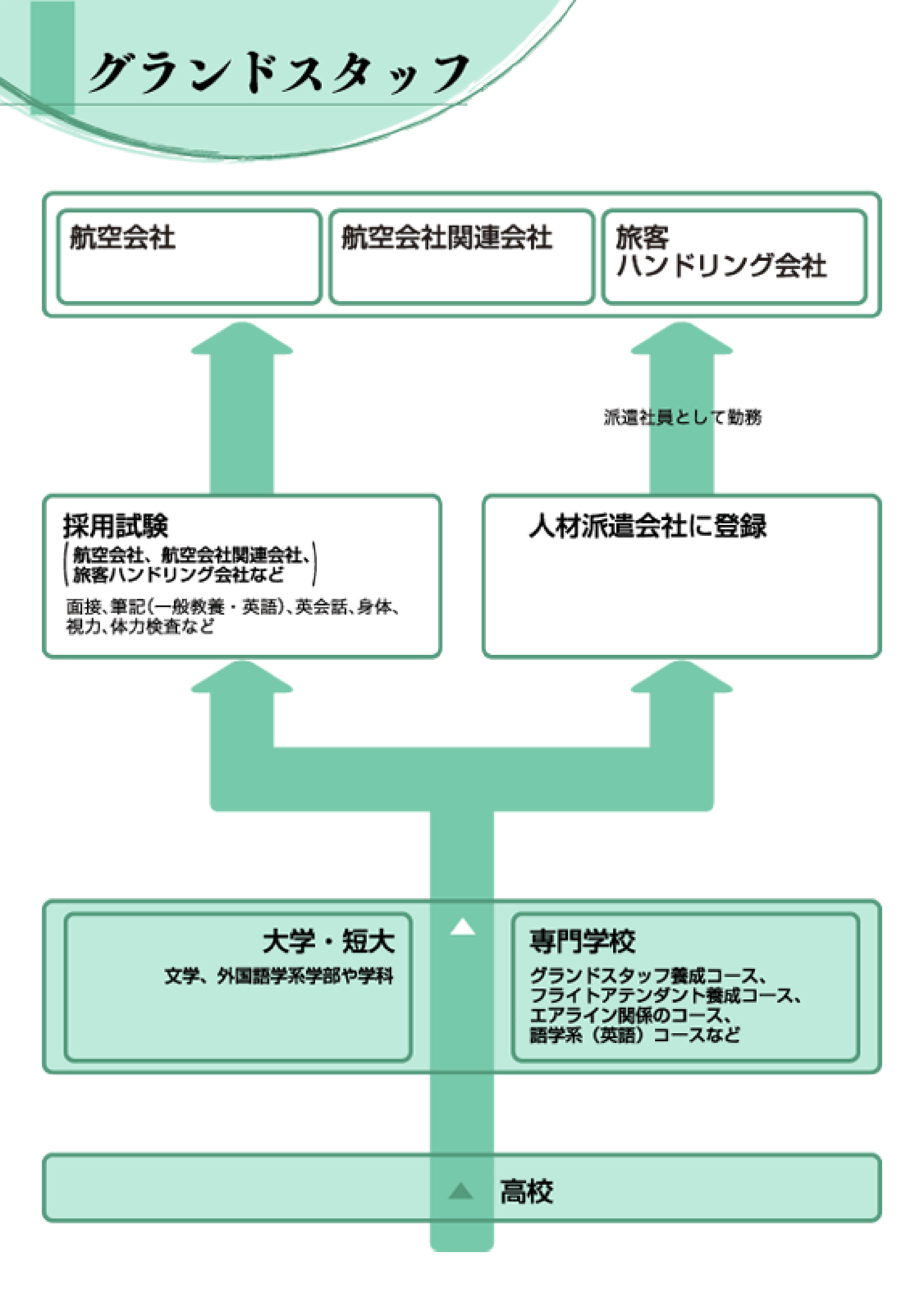 各航空会社やその関連企業に入社し、全国各地の空港で勤務する。派遣会社に登録して仕事を得ることも。