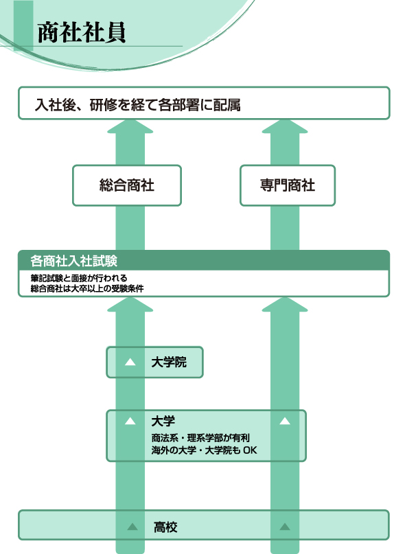 商社には、ミネラルウォーターから通信衛星まで何でも取り扱う総合商社と、ある特定の分野の品目に強みを発揮する専門商社がある。総合商社は、三菱商事、三井物産、伊藤忠商事、住友商事、丸紅、双日、豊田通商の7社。ちなみに「商社マン」とは、一般に商社の営業職を言う場合が多い。