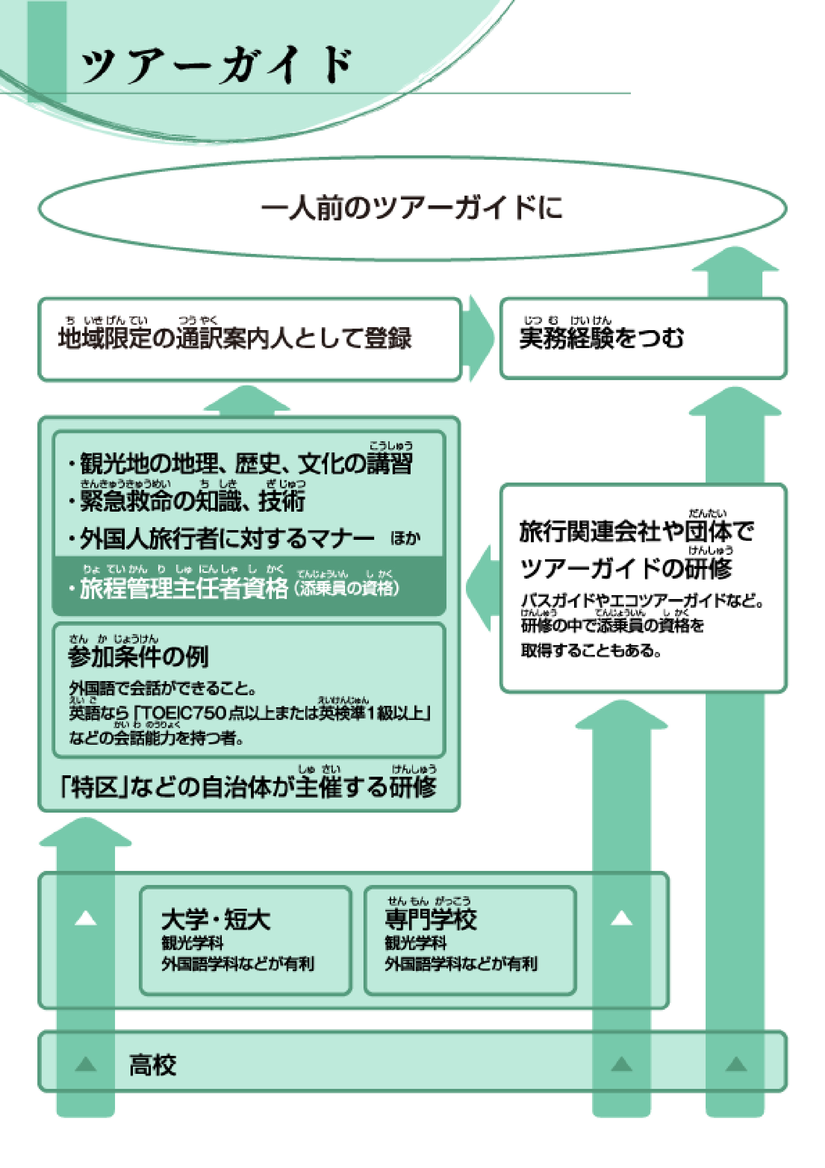 国内で日本人相手のツアーガイドをする場合は特別な資格は必要ないが、外国語を使って外国人観光客を案内する場合は「通訳案内士」の国家資格が必要だ。しかし、最近はその制度が見直されている。「特区」と呼ばれる特別な地域の自治体として認められれば、その特区の中に限って通訳案内士の資格がなくても外国人観光客を案内できる新たな制度ができたのだ。その制度で認められる通訳ガイドをツアーガイドと呼んで、これまでの、通訳案内士と区別することもある。本来のツアーガイドは添乗員の仕事はできないが、新たな通訳ガイドは研修に添乗員の資格である「旅程管理主任者」の取得が組みこまれ、添乗員の仕事もできることが多い。