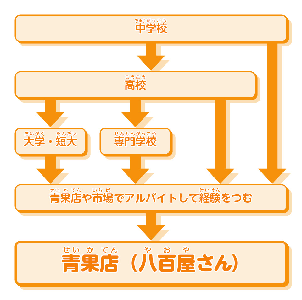 青果店(せいかてん)八百屋(やおや)さん)の仕事(しごと)につくための(おも)なルートが一目(ひとめ)()かるチャートだよ!