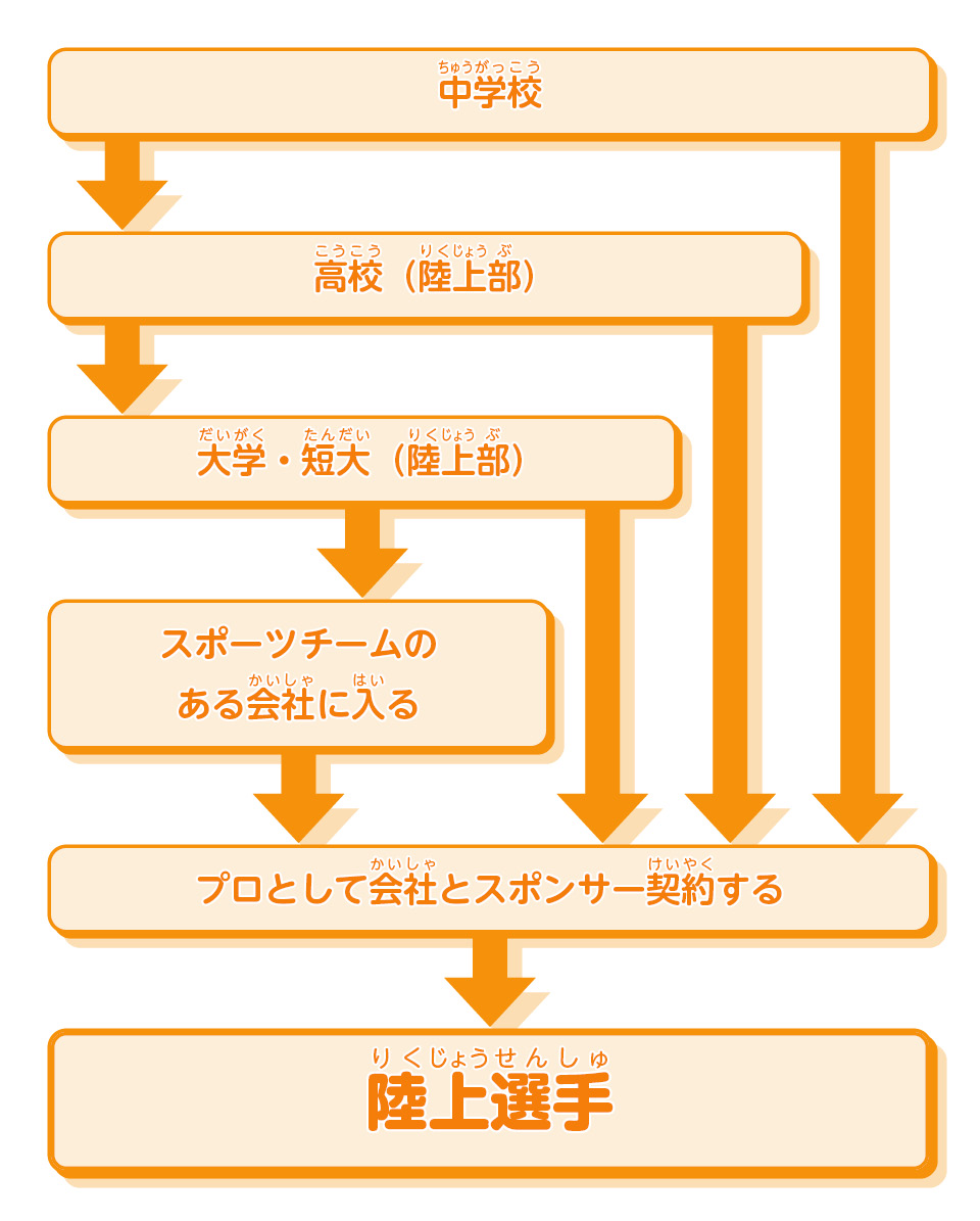 陸上競技で生活できる選手になるには、何よりも大会で記録を残すことが大切だ。高校のインターハイや大学選手権などで、ずばぬけた結果を出せば、実業団からのスカウトも期待できる。そのためにはまず、陸上競技に熱心な高校や大学に入り、練習環境が整った中でレベルアップを目指そう。チーム内にライバルも多いので、たゆまぬ努力が必要だ。
