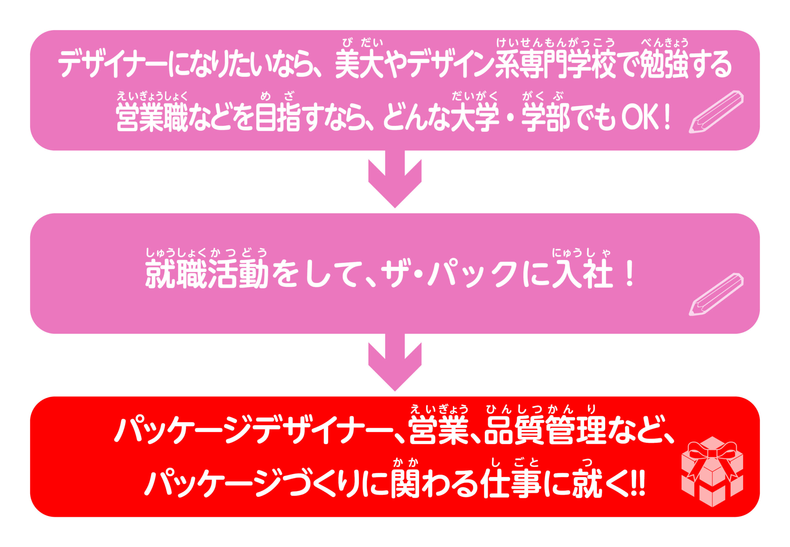 パッケージづくりに関わる職種は、デザイナー、営業、品質管理、工場のオペレーターなどいろいろあるよ。「パソコン上のデザインソフトを使いこなしてお客さまのご要望を形にする“デザイナー”になりたいのであれば、美術系の大学や専門学校を出ていたほうがよいですね」と大内先生。一方、お客さんの要望を聞く営業や、パッケージの品質を保つためにチェックする品質管理といった職種の場合は「どの学部、学科でも問題ない」とのこと。なりたい職種をイメージして進路を選ぶといいだろう。ちなみに大内先生は、大学の工学部で電子工学を学び、なぜか電子工学とはまったく関係ないザ・パックに就職したそう。「電子工学を学んだからこそ、アナログで手触り感のあるものに携わりたいと思うようになりました」と話してくださいました。入社後は、営業、人事などの仕事を経験。現在は会社の魅力を伝える広報の仕事をしているよ!
