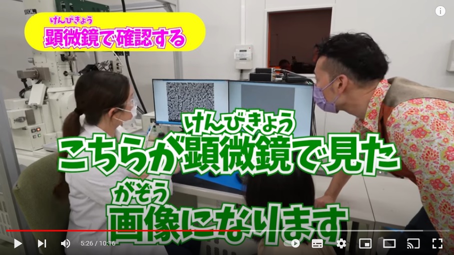 カメラに写っていないところでも、たくさんの人が動いていて、細心の注意を払いながら動画が作られているんだね。これは、撮影前に顕微鏡で見た画像について説明を受けているところ。動画で見せるべきポイントなどを確認しているんだ。