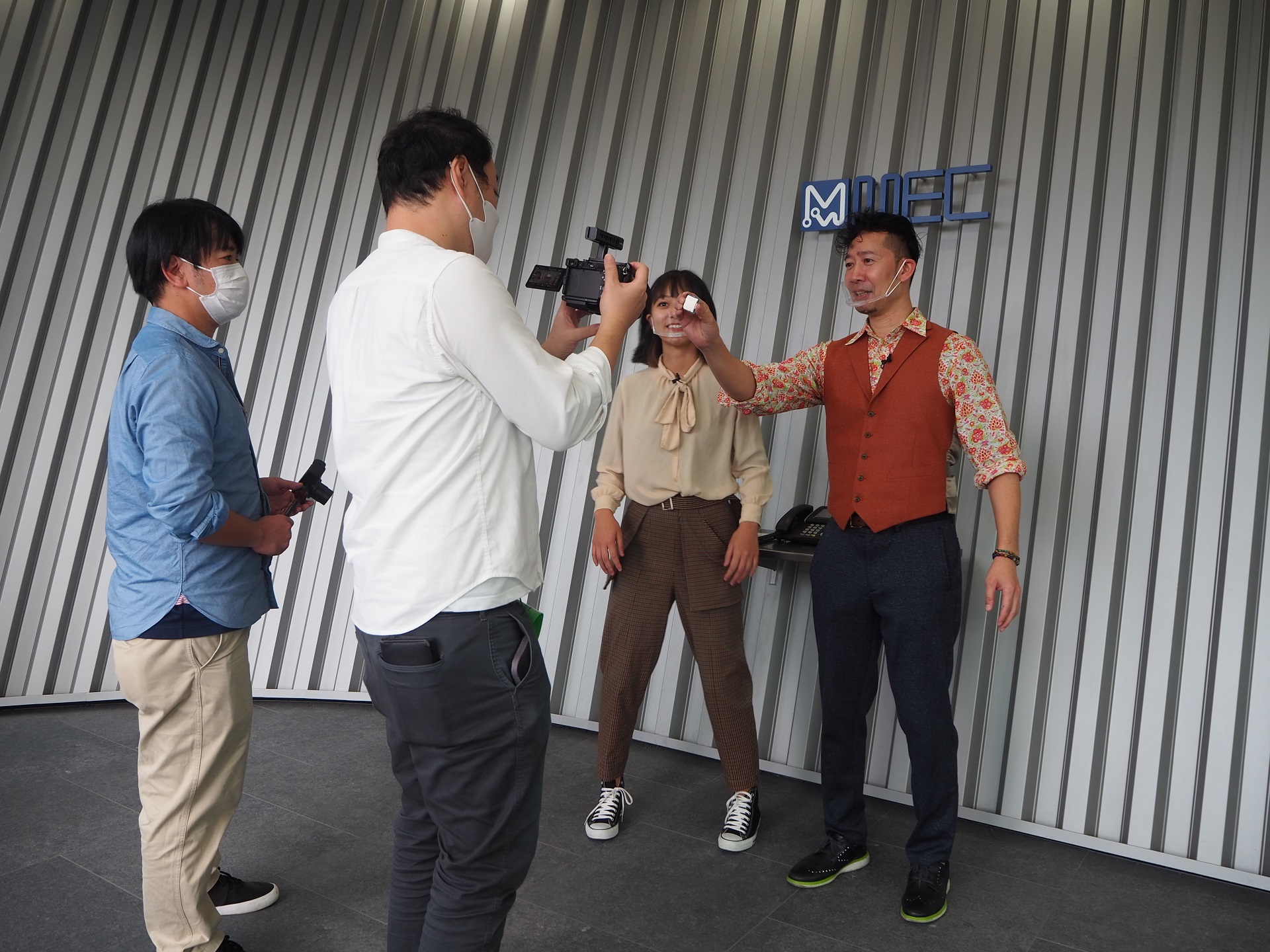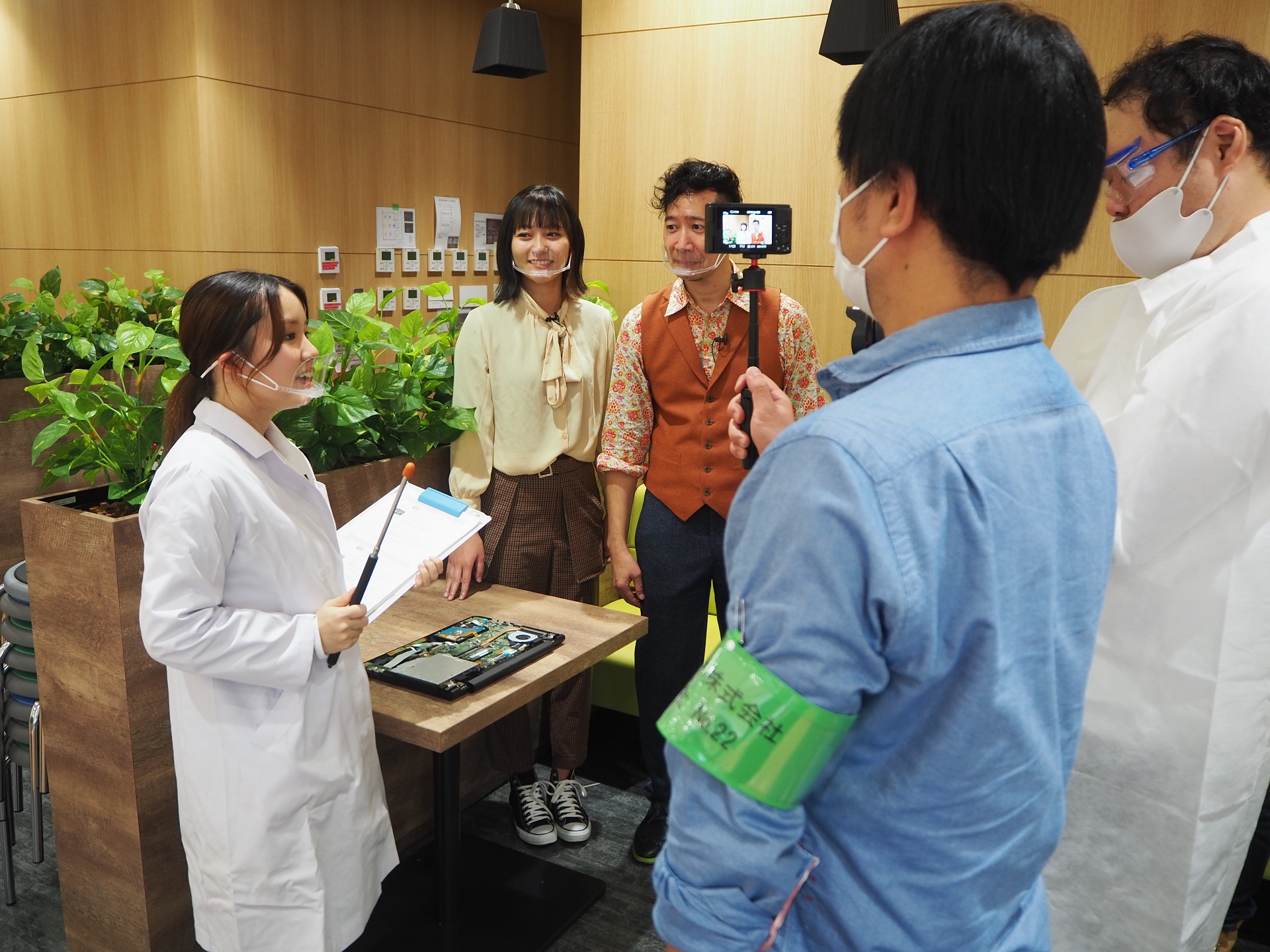 このほかにも、食堂の一角を使って研究開発本部の井上さんの説明を聞いたり、玄関にある会社のロゴの前でクイズを出したり、いろいろな場所で撮影が続けられたよ。