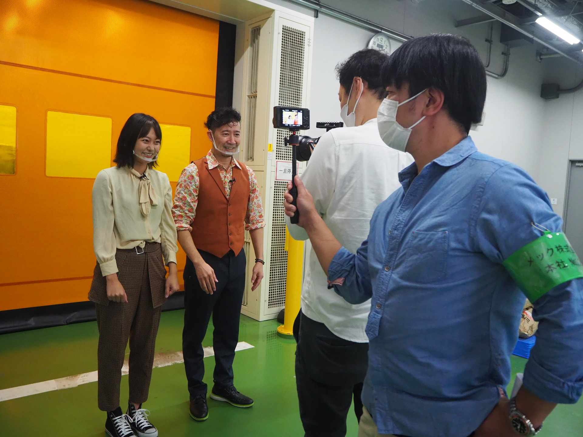 続いては、キャプテンとアヤノちゃんの登場シーンを撮影しているね。ふたりの後ろにあるオレンジの扉が上から降りてくるタイミングを何度もはかっていたよ。どのシーンもいきなり撮影するんじゃなく、リハーサル(練習)を繰り返してから本番の撮影に入るんだって。
