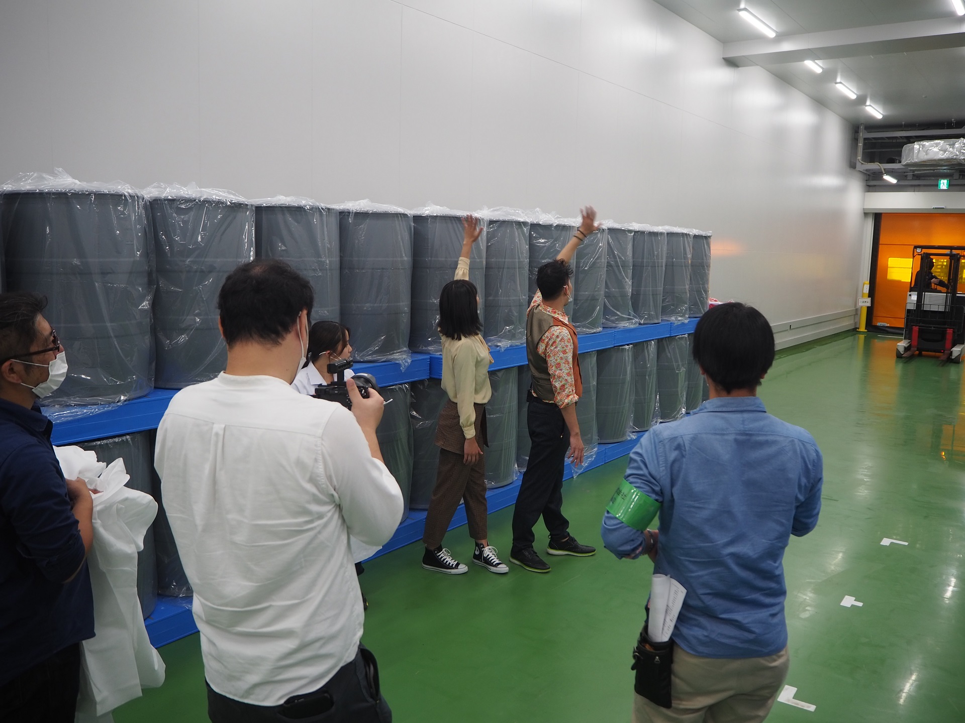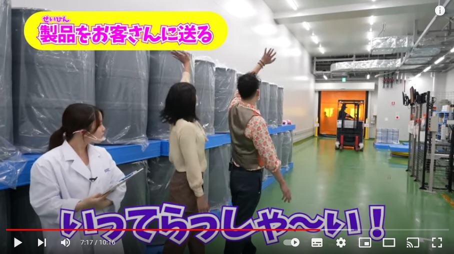 たとえば、この「製品をお客さんに送る」シーン。フォークリフトに乗ったメックのスタッフさんを「いってらっしゃ~い!」と見送るほんの7秒ほどのシーンだけど、フォークリフトの操作手順や画面のどのあたりに映るかを何度も何度もリハーサルしてから撮影したんだよ。