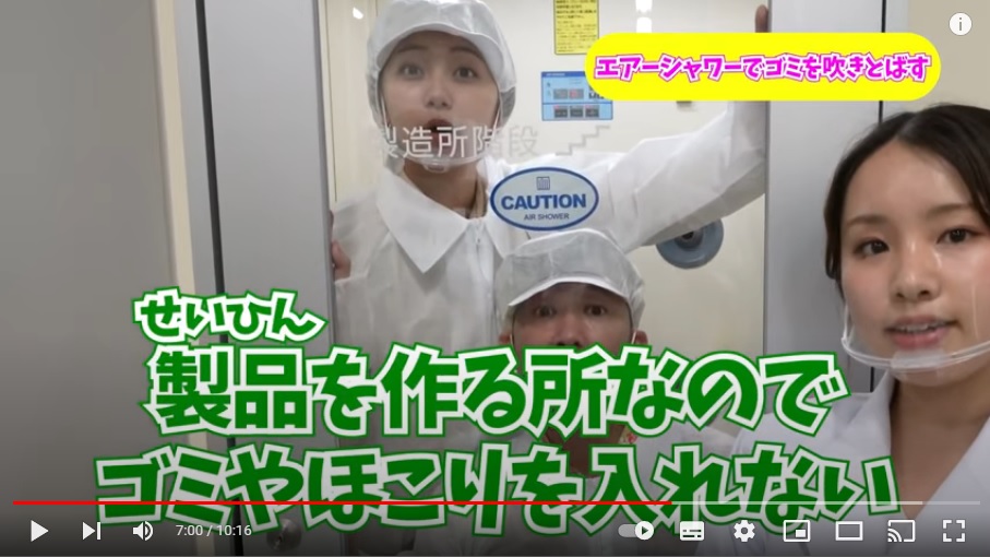 続いてはこちら。製品を作る場所に入るには、ゴミやほこりを中に入れないために、特別な白衣に着替えて帽子をかぶってエアシャワーを浴びたよ。キャプテンとアヤノちゃんだけでなく、撮影しているスタッフさんみんなが同じように着替えてエアシャワーを浴びたんだよ。